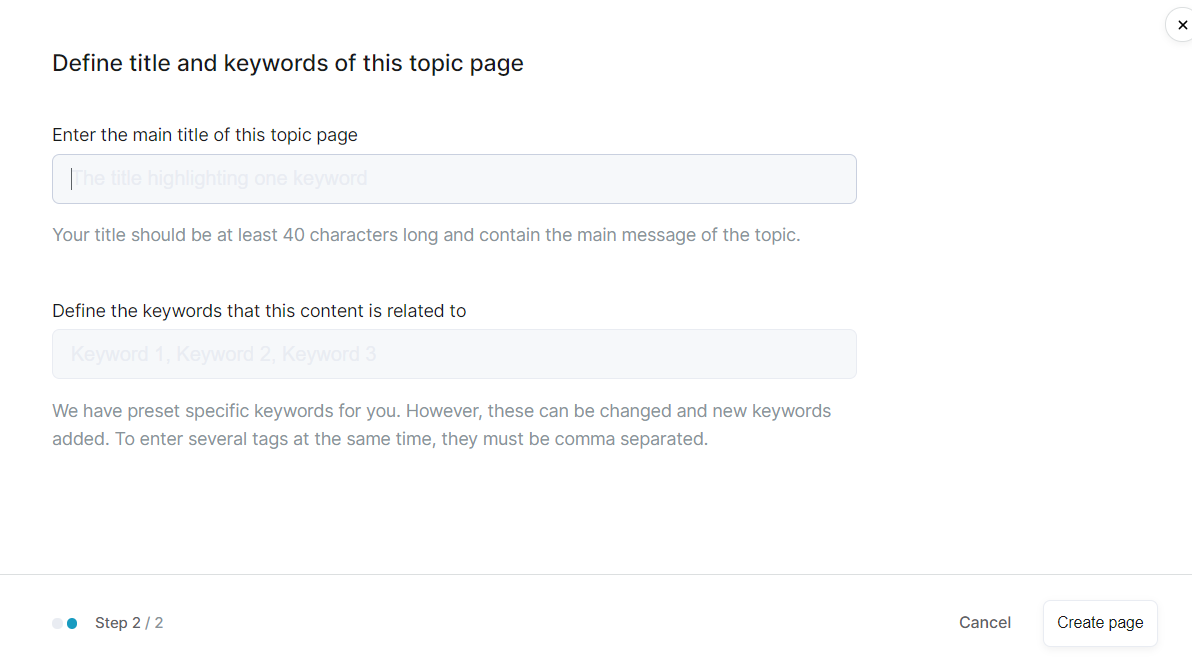 Im darauf folgenden Fenster können Sie den Namen der Seite (Themenbereich) festlegen sowie weitere Keywords. Sollten Sie keine weiteren Keywords einfügen, werden die Keywords verwendet, die wir für Sie recherchiert haben. Klicken Sie auf "Create page" um die Seite zu erstellen.
